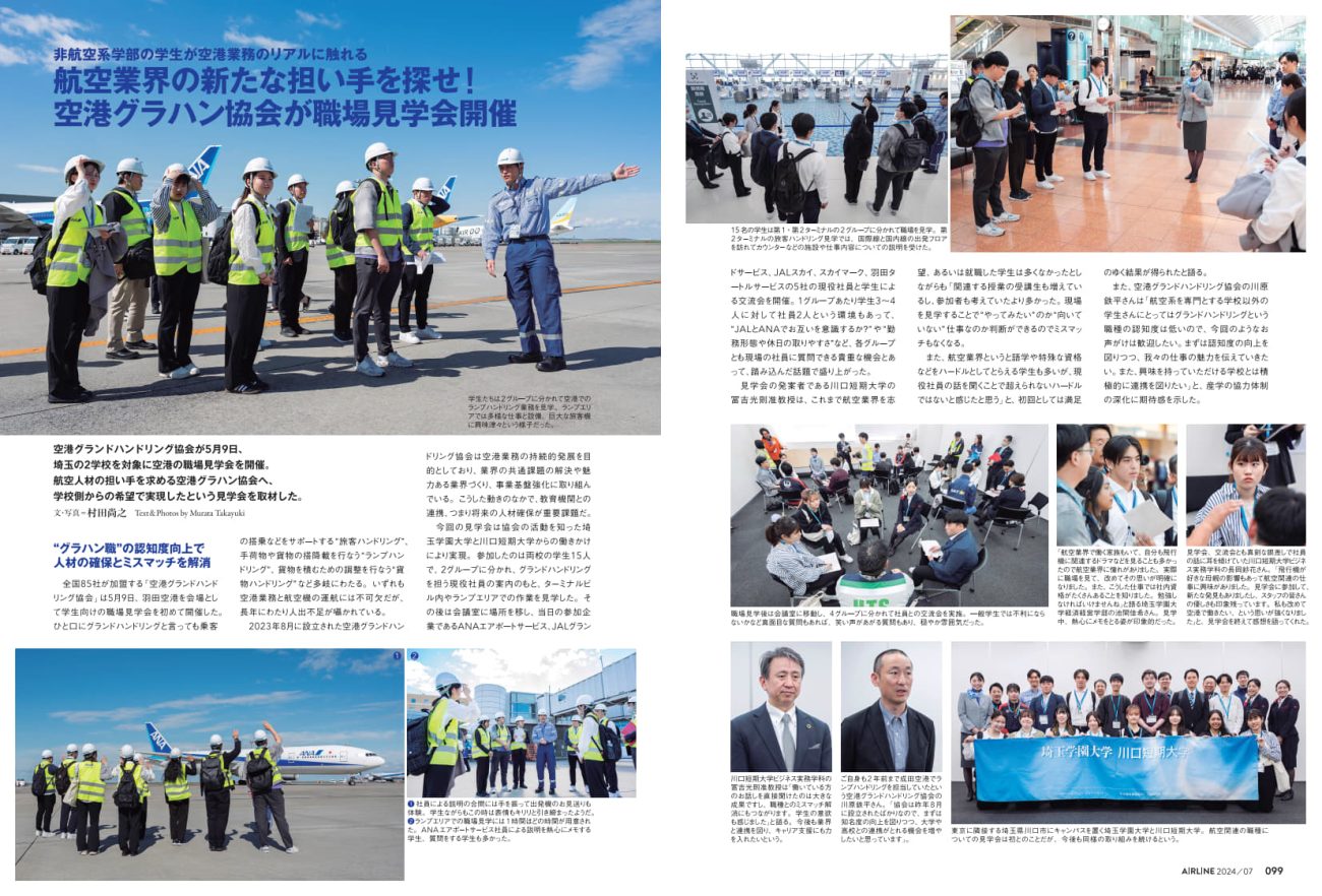 空ハン協と学校との取り組みとしては、2024年度に埼玉学園大学、川口短期大学の学生を対象とした空港見学会を羽田空港で開催。両校とは2025年度にも継続して開催されたほか、他空港でも学校と連携した空港見学会を実施している。