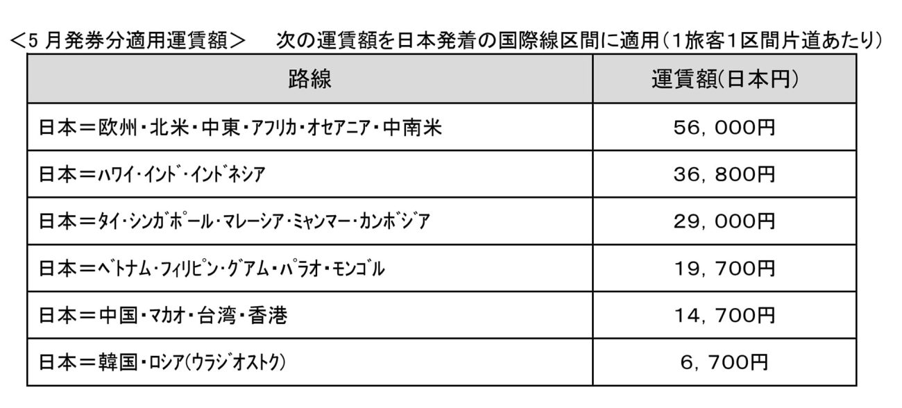 JAL日本発着便の5月1日~6月30日発券分適用額。