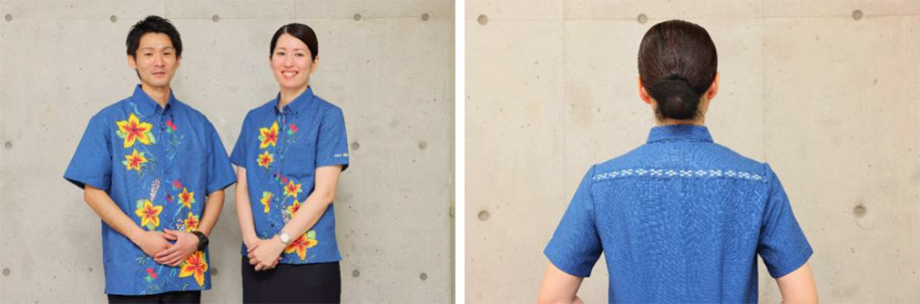 デザインは既存の制服との親和性を考慮し、落ち着いた「紺色」をベースカラーに、モチーフとして沖縄県の県花である「デイゴ」を採用して沖縄らしさを表現。背面には社員の要望を反映して「ミンサー柄」のワンポイントをあしらった。