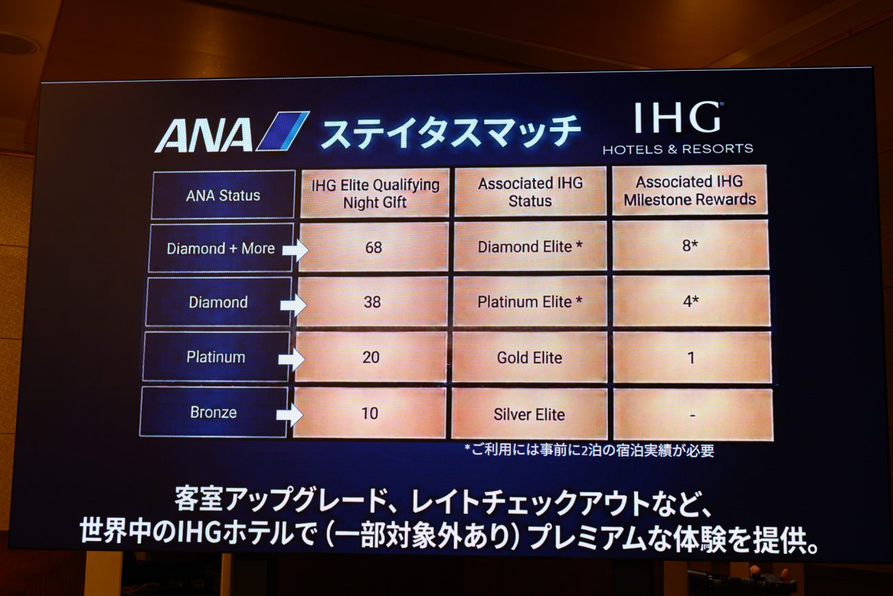 ANAマイレージクラブのステータスに応じて、IHGのエリートステータスが提供されるもの。具体例として、ANAのダイヤモンド+More会員には、68泊分の宿泊実績が提供され、2泊の滞在でIHGの最上位「ダイヤモンドエリート」へとマッチングされる。