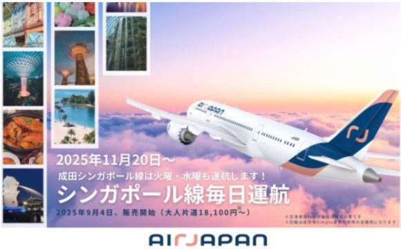 AirJapan、成田=シンガポール線を増便。11月20日よりデイリー運航に